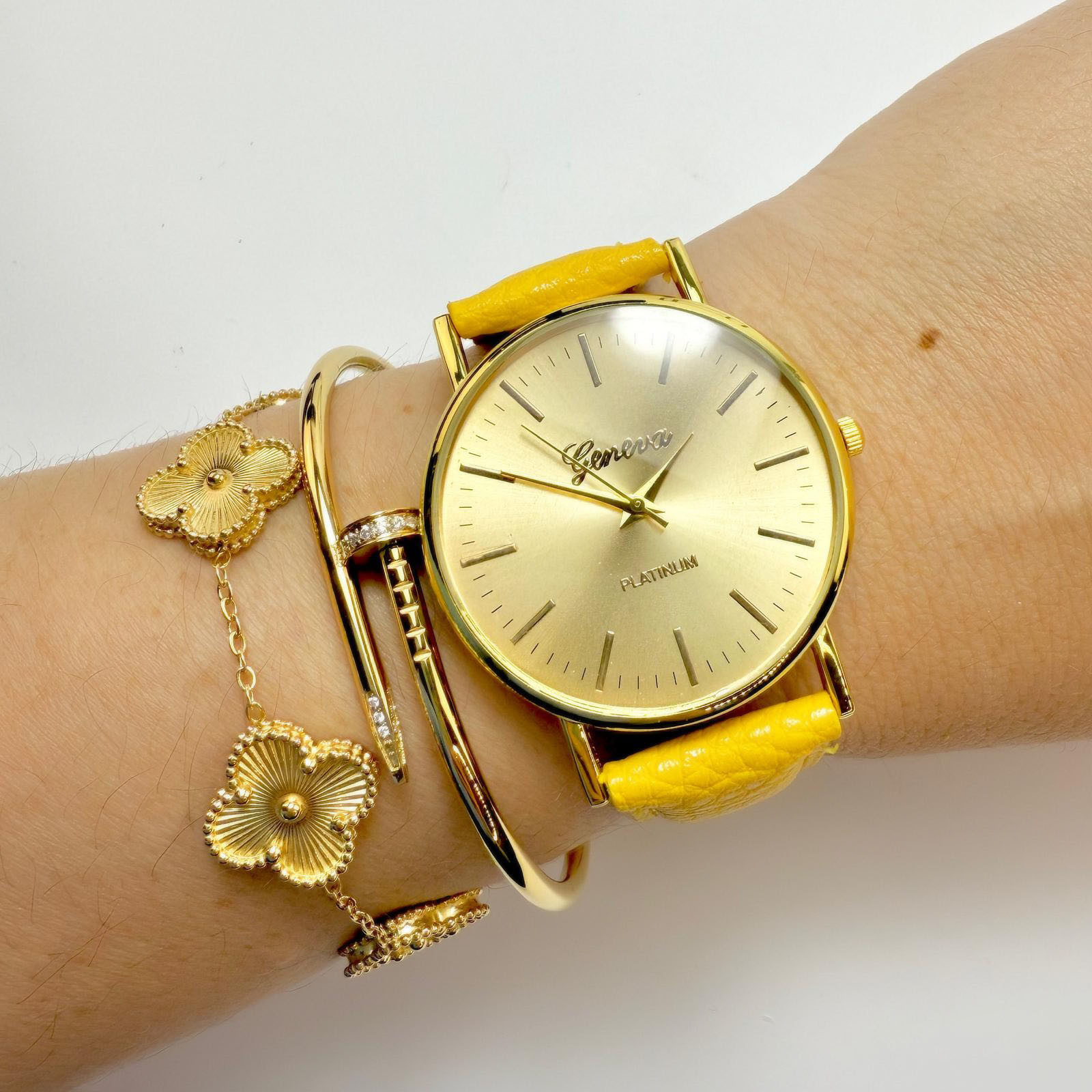 Značka : GenevaMateriál : Chirurgická oceľ, Bižutéria, Eko-kožaUrčené pre : ŽenyFarba remienka/náramku : ŽltáDĺžka remienka : 22 cmMožnosť regulácie dĺžky : Áno (náramok je možné nastaviť)Farba ciferníka : ZlatáŠírka ciferníka : 37 mmStrojček hodiniek : Bateriový quartzFunkcie hodiniek : ČasDarčeková krabička : Bez krabičkyPoznámka : Hodinky sú dodávané bez doplnkov- Instagram Photos